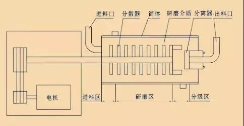 預先進行分散潤濕處理的固-液相混合物料經(jīng)計量泵,從臥式砂磨機上部進料管輸入筒體內(nèi),電動機帶動主軸上的分散器旋轉(zhuǎn)產(chǎn)生動能,物料和筒體內(nèi)的研磨介質(zhì)一起被高速旋轉(zhuǎn)的分散器攪動,從而使物料中的固體微粒和研磨介質(zhì)相互間產(chǎn)生強烈的碰撞、摩擦、剪切作用,介質(zhì)間的物料粒子受力變形并產(chǎn)生應力場。當應力達到顆粒的屈服或斷裂極限時,便產(chǎn)生塑性變形或破碎。未被粉碎的顆粒受離心力作用被甩向砂磨機筒壁,此區(qū)研磨介質(zhì)密度最大,從而強化了粉碎作用,粉碎后的微小顆粒經(jīng)分離器與研磨介質(zhì)分離后,從出料管流出。