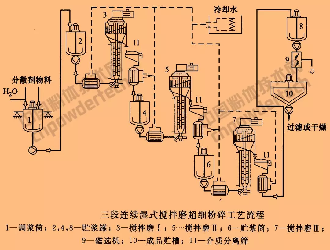 △上圖是較典型的三段連續(xù)式攪拌磨重質(zhì)碳酸鈣超細(xì)粉碎工藝流程,主要由三級濕式攪拌磨或研磨剝片機(jī)及相應(yīng)的貯罐和泵組成。原料經(jīng)調(diào)漿筒1添加水和分散劑調(diào)成一定濃度或固液比的漿料后給入貯漿罐2,通過貯漿罐2泵入攪拌磨I 3中進(jìn)行研磨。經(jīng)攪拌磨工研磨后的料漿分離研磨介質(zhì)后給入貯漿罐4,通過貯漿罐4泵入攪拌磨II 5中進(jìn)行第二次(段)研磨;經(jīng)第二次研磨后的料漿經(jīng)分離研磨介質(zhì)后進(jìn)入貯漿筒6,然后泵入攪拌磨III 7中進(jìn)行第三次(段)研磨;經(jīng)第三次研磨后的料漿進(jìn)入貯漿罐8,并用磁選機(jī)除去鐵質(zhì)污染及含鐵雜質(zhì)。如果該生產(chǎn)線建在靠近用戶或離用戶較近的地點(diǎn),可直接用管道或料罐送給用戶。如果較遠(yuǎn),則將料漿進(jìn)行脫水,然后進(jìn)行打散和包裝。