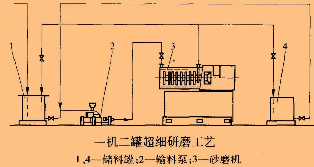 料漿在1臺砂磨機(jī)、2只儲料罐內(nèi)進(jìn)行循環(huán)研磨。此工藝雖比一機(jī)一罐工藝復(fù)雜些,但循環(huán)研磨層次清楚,產(chǎn)品粒度均勻。